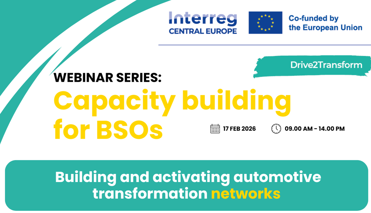 V sklopu projekta Drive2Transform bo potekal 17. 2. 2026 od 9.00 do 14.00 spletni seminar, ki je namenjen reprezentativnim grozdom in drugim podpornim organizacijam, ki delujejo na področju avtomobilske industrije in mobilnosti. Odgovarjali bodo na vprašanje: kako uspešni grozdi in agencije podpirajo transformacijo v avtomobilski industriji? Prejeli boste ekskluziven vpogled v strategije različnih organizacij za podporo […]