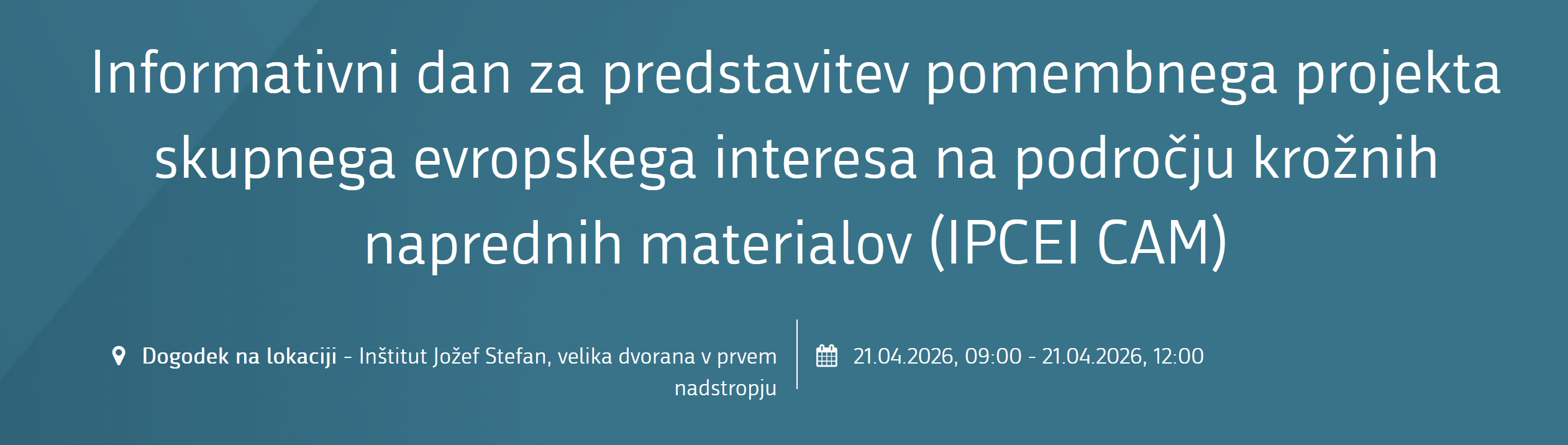 V sodelovanju z Ministrstvom za gospodarstvo, turizem in šport organiziramo informativni dan Pomembni projekti skupnega evropskega interesa za krožne napredne materiale (IPCEI CAM), ki bo potekal 21. 4. 2026 od 9.00 do 12.00 v Veliki predavalnici Instituta "Jožef Stefan" (1. nadstropje), Jamova cesta 39, Ljubljana. Dogodek je namenjen predstavitvi skupnega evropskega projekta na področju naprednih […]